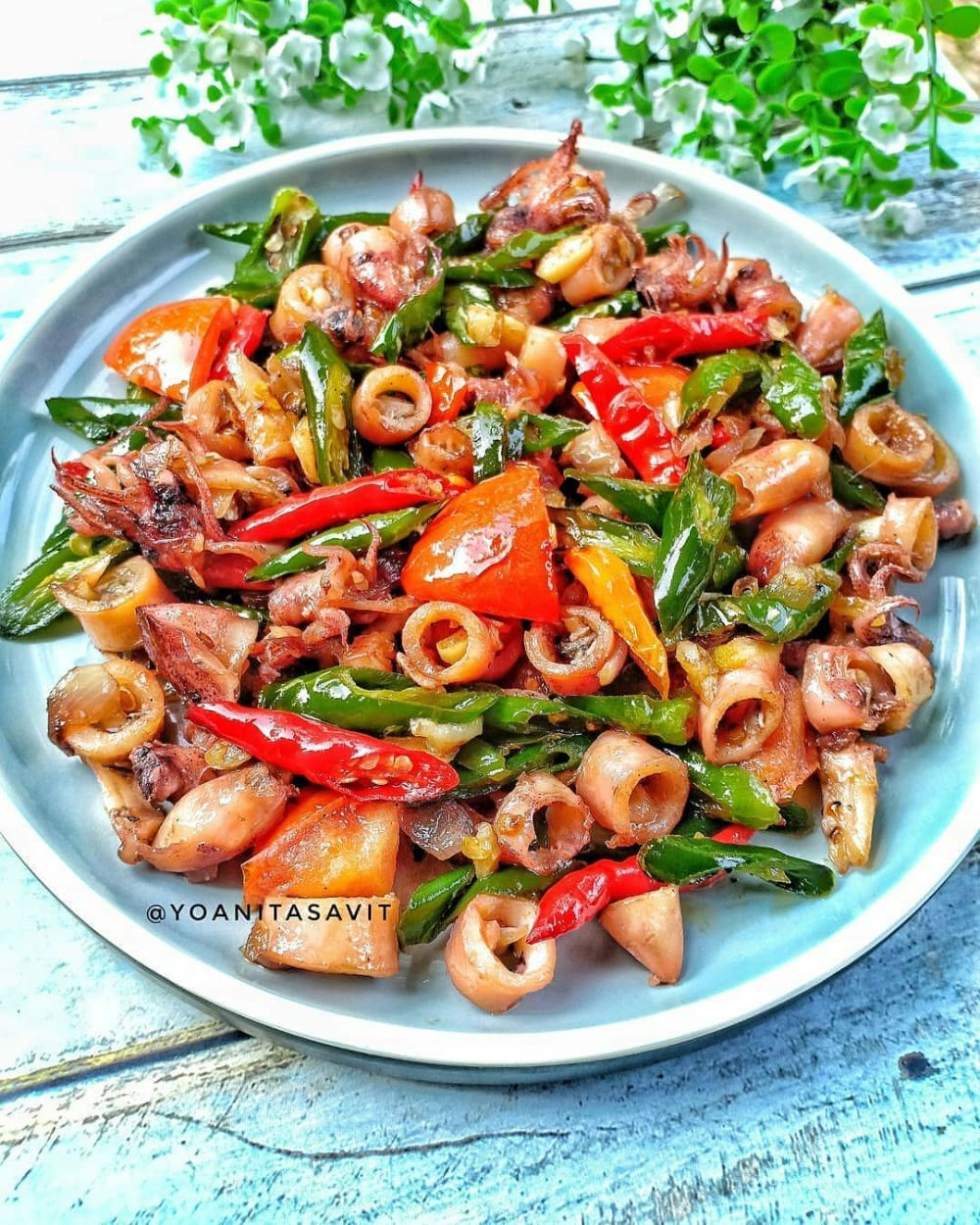 – Tambahkan cumi -cumi dan cabai hijau, tambahkan saus tiram, gula, kaldu bubuk dan tomat. Masak sampai rempah -rempah diserap. Koreksi rasa, hapus dan sajikan.