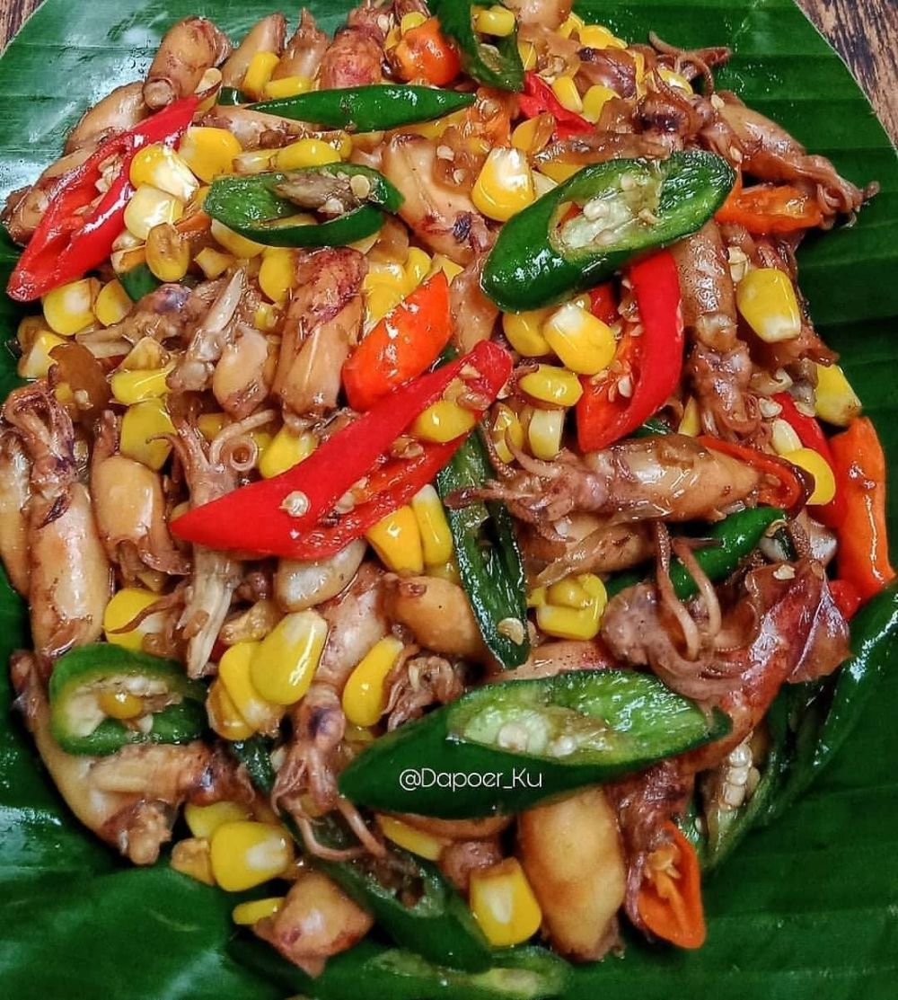 – Tambahkan jagung dan cumi tambahkan cabai hijau, saus tiram, gula dan kaldu bubuk. Tambahkan sedikit air jika perlu, masak sampai rempah -rempah diserap. Koreksi rasa, hapus dan sajikan.