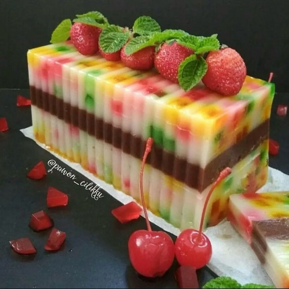 Puding yang satu ini dijamin disukai oleh anak -anak karena warnanya yang ceria. Lapisan lembut puding susu putih diselingi dengan potongan jeli berwarna -warni seperti pelangi. Rasanya manis dan segar, sangat cocok untuk makanan ringan keluarga.