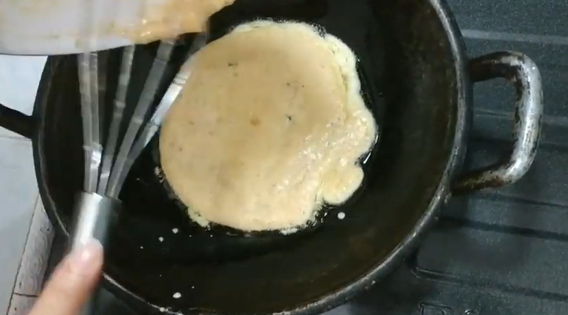 Panaskan sedikit minyak di wajan, tuangkan campuran, dan ratakan. Goreng ke permukaan bawah coklat, lalu balikkan kembali. Masak sampai kedua sisi dimasak dengan sempurna.