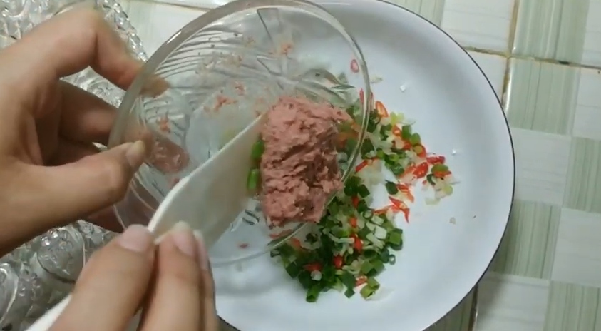 Tambahkan bawang putih, bawang, dan cabai rawit ke dalam mangkuk. Tambahkan daging kornet, garam, dan gula secukupnya.